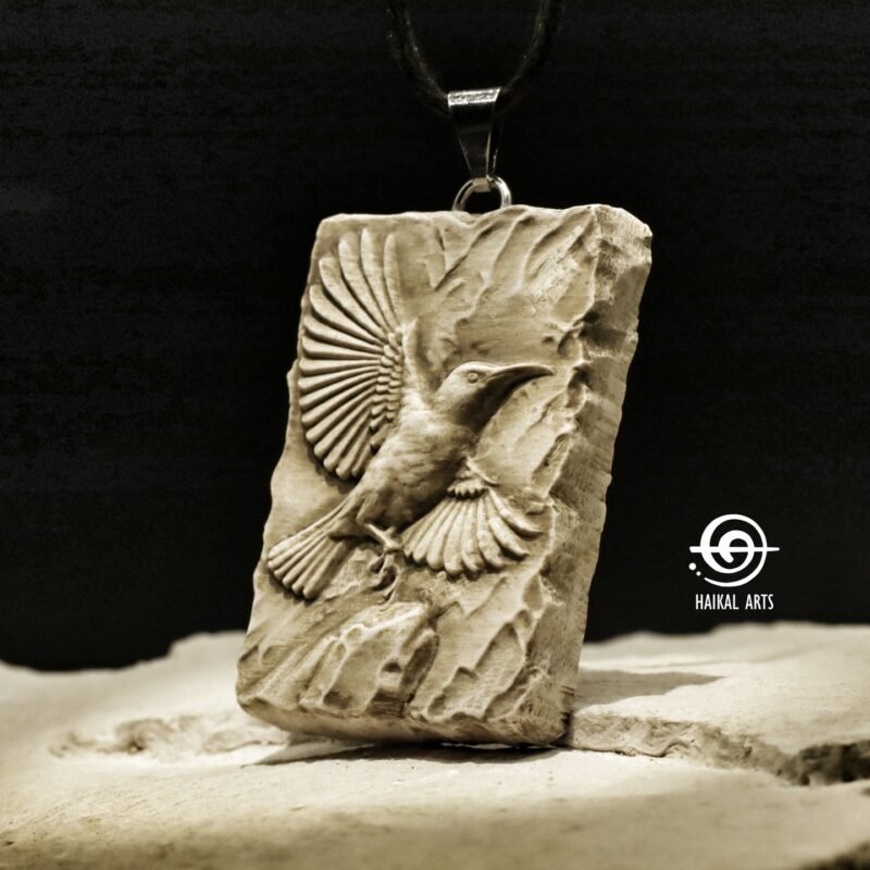 قلادة عصفور الشمس – تحفة من حجر، تحلّق بروح الحرية قلادة “عصفور الشمس” من أعمال الفنان التشكيلي علاء أبو هيكل