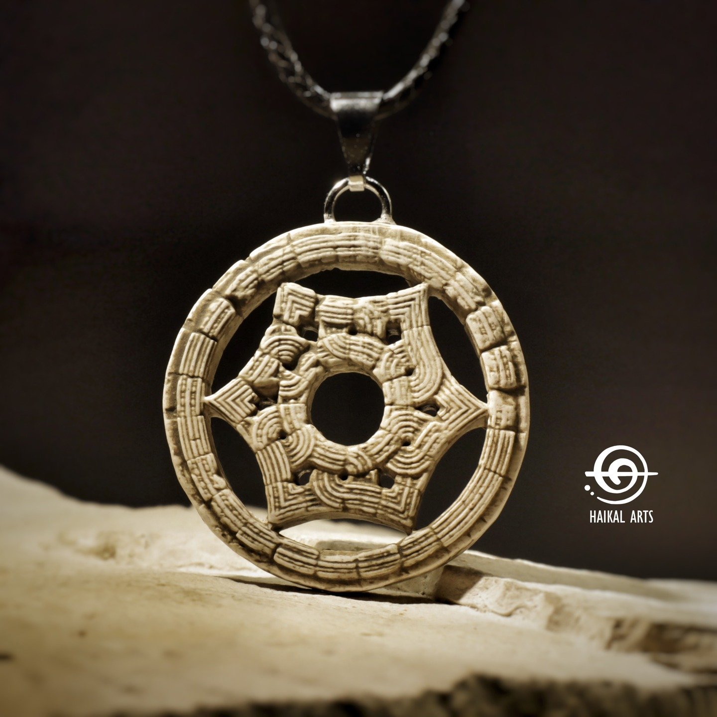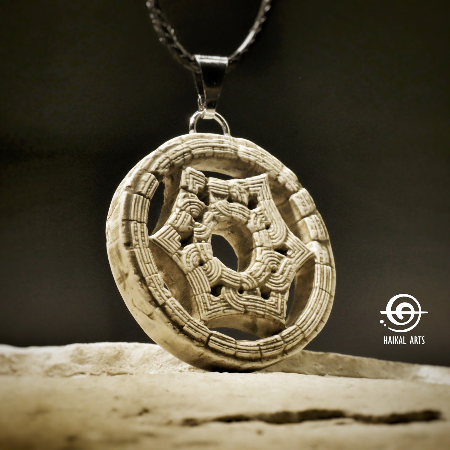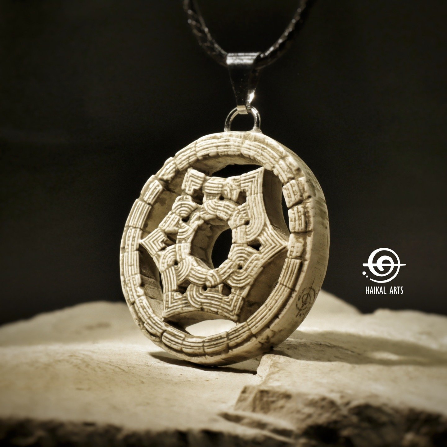 نحتها الفنان الفلسطيني علاء أبو هيكل بدقّة استثنائية، لتصبح أكثر من مجرد قلادة… إنها قطعة من تراث فلسطين المحفور في الحجارة، تنطق بلغة الأجداد، وتعيد إحياء مجدٍ لا يُنسى.